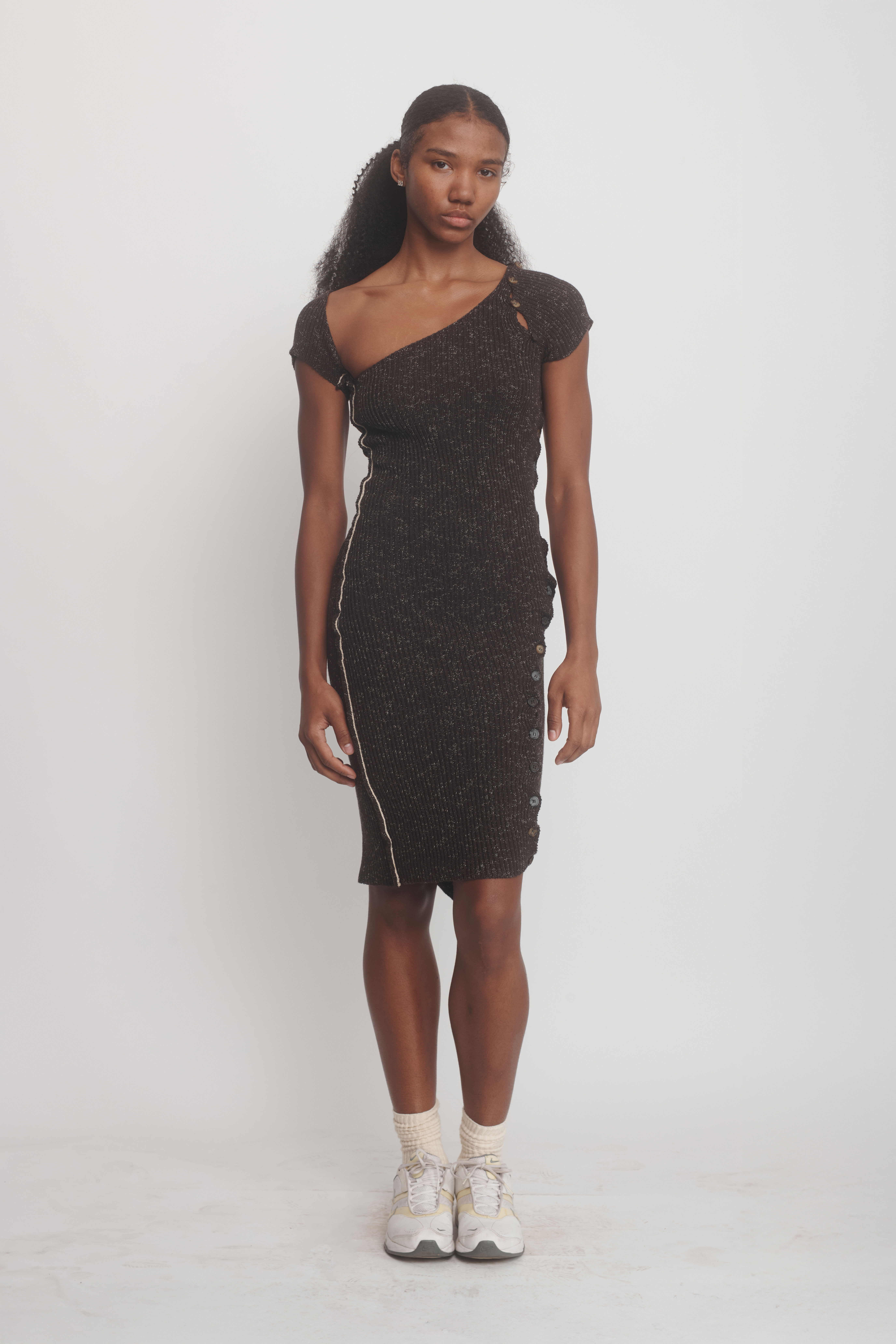 Knitted midi dress featuring asymmetrical buttons.