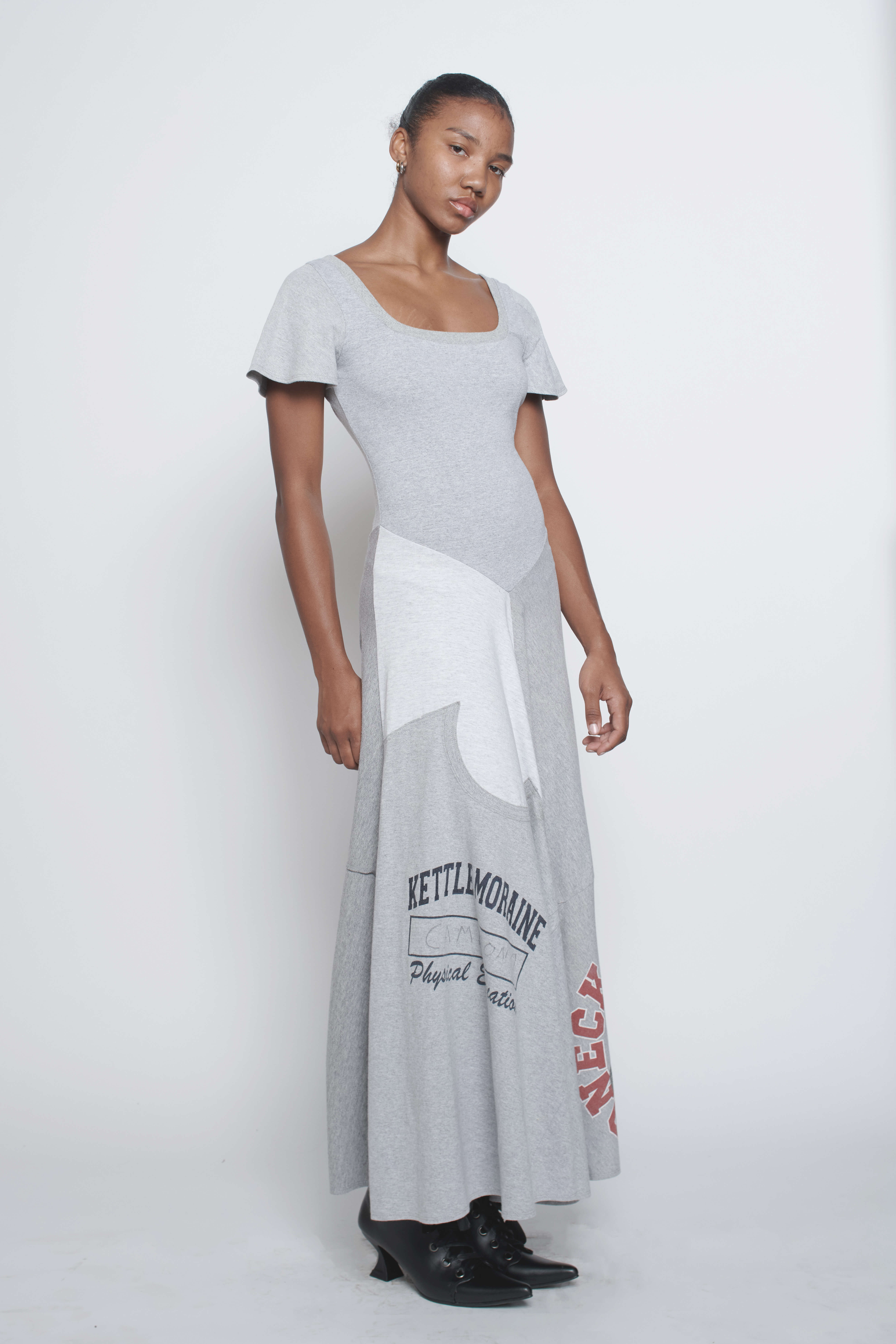 1930’s style ankle-length dress with v-shape waist. Sourced from vintage deadstock t-shirts. Every dress is unique.