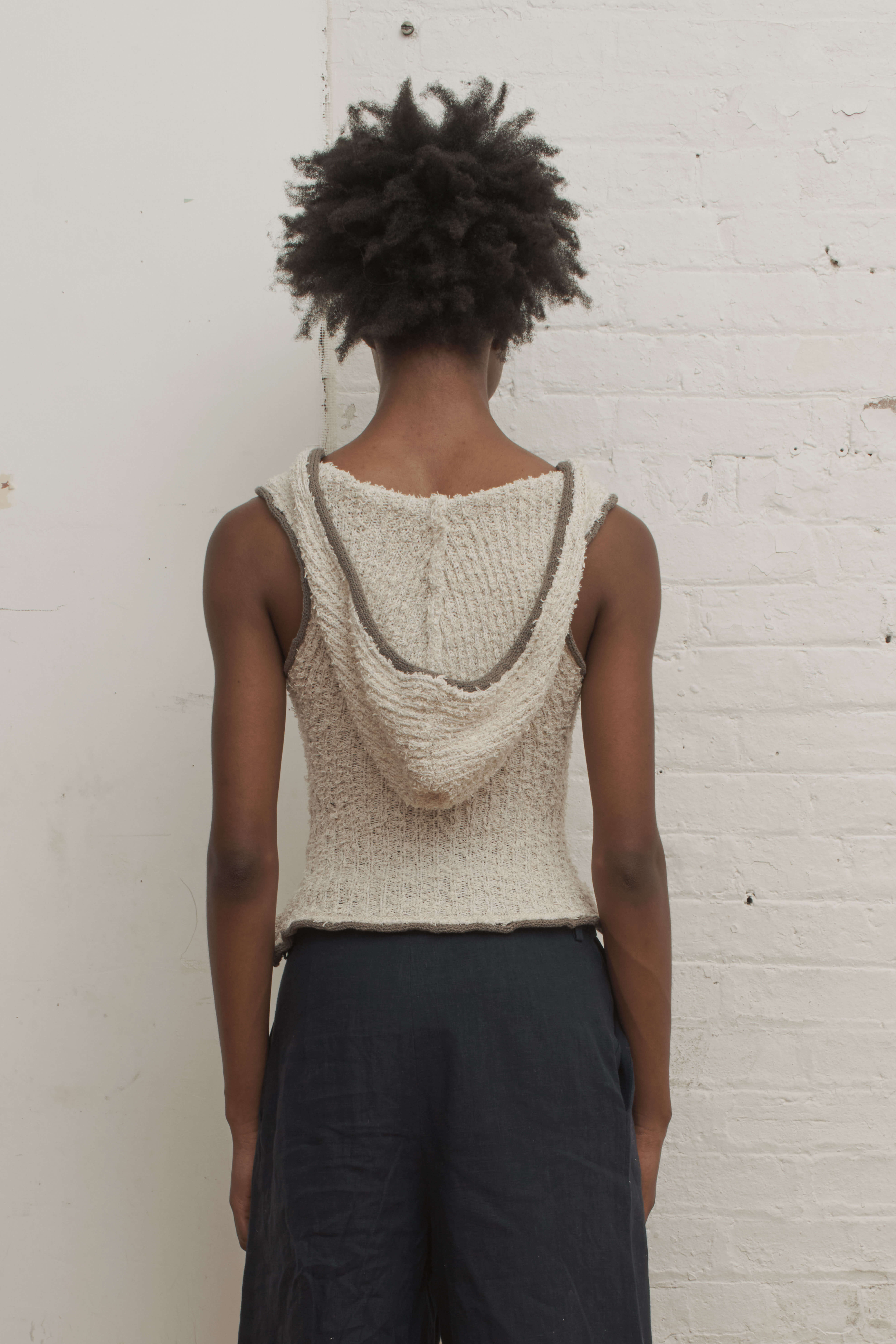Shaggy sleeveless tank with grey trims and hood. Features asymmetrical point at front right and wide scoop neck.