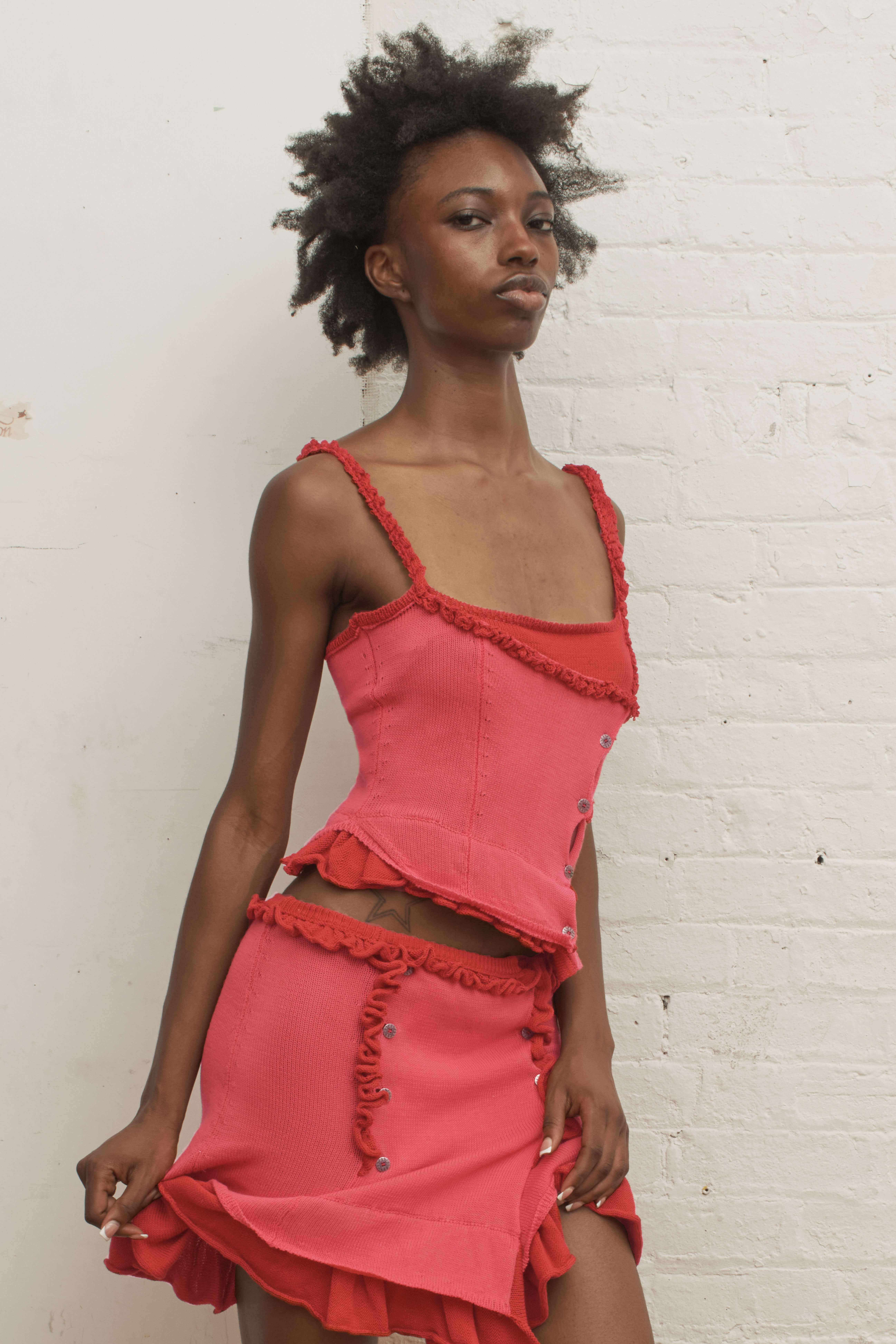 Cotton tank featuring metal buttons. Ruffled red trims throughout.